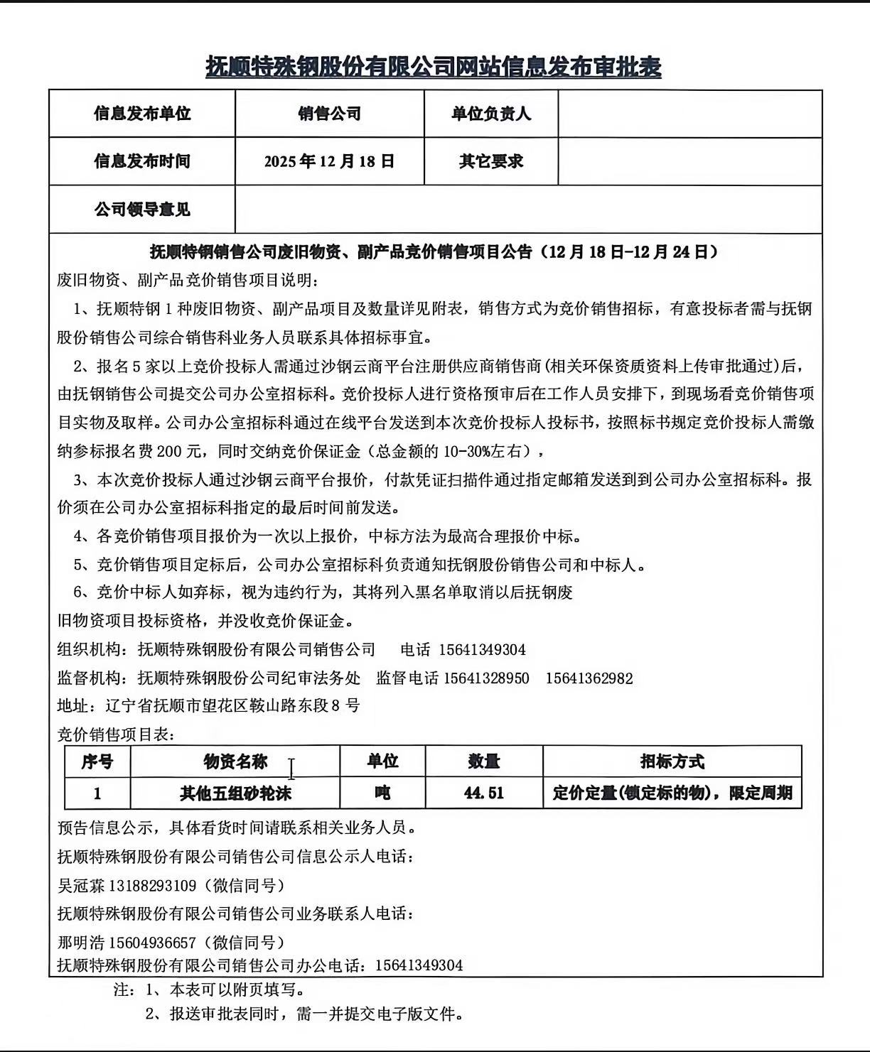 撫順特鋼銷售公司廢舊物資、副產品競價銷售項目公告(12月18日-12月24日)