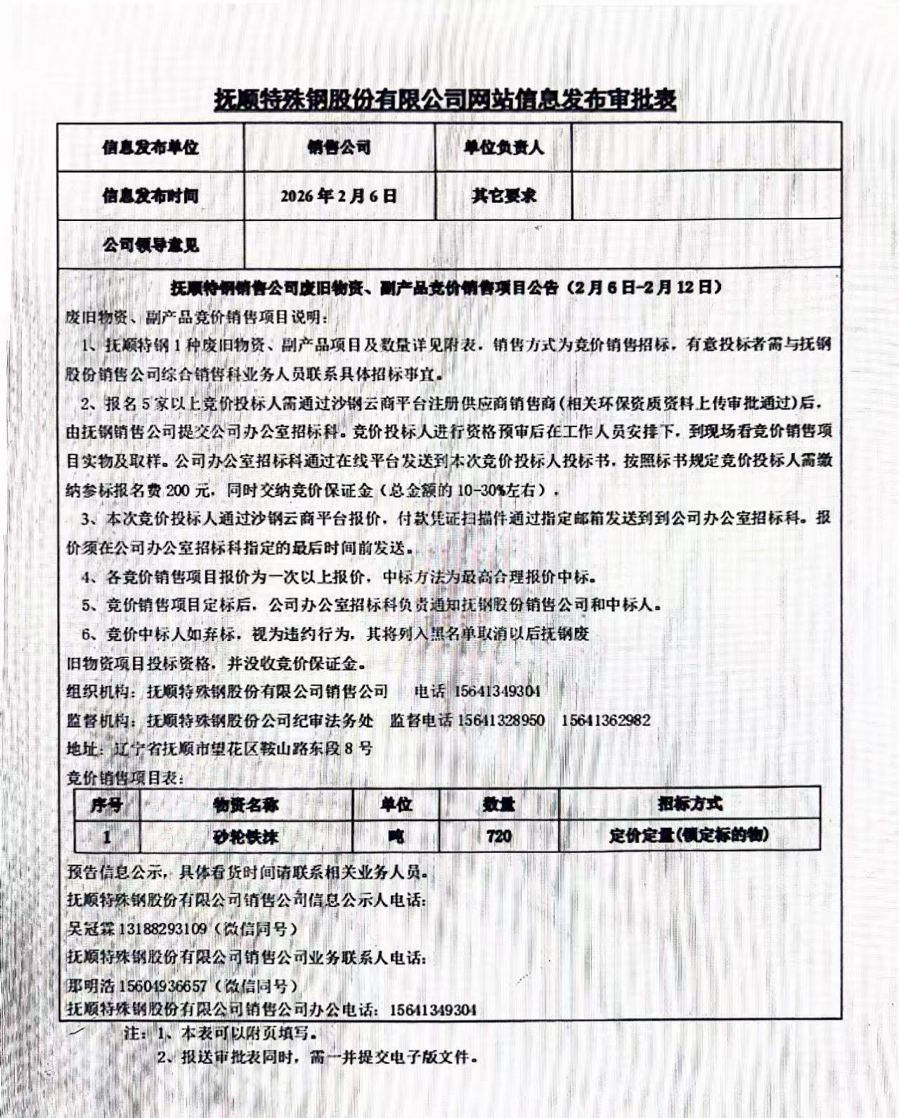 撫順特鋼銷售公司廢舊物資、副產(chǎn)品競(jìng)價(jià)銷售項(xiàng)目公告(2月6日-2月12日)