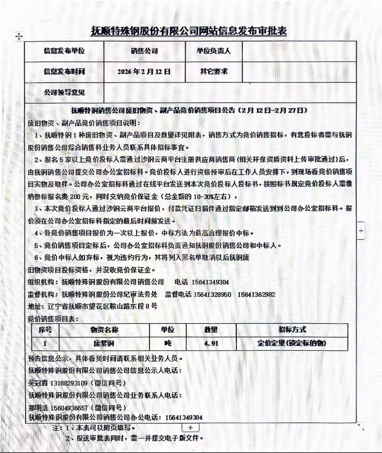 撫順特鋼銷售公司廢舊物資、副產(chǎn)品競(jìng)價(jià)銷售項(xiàng)目公告(2月12日-2月27日)